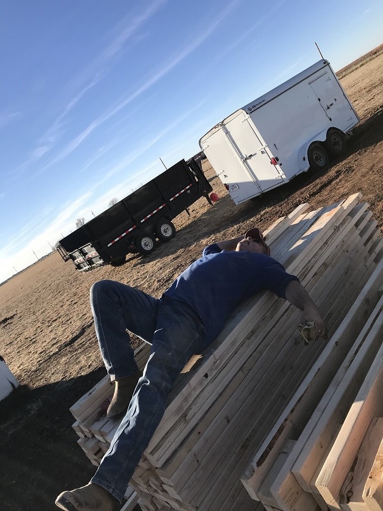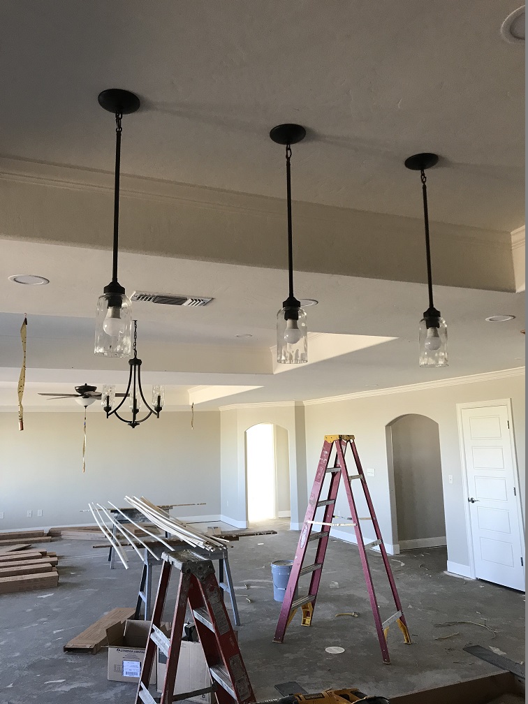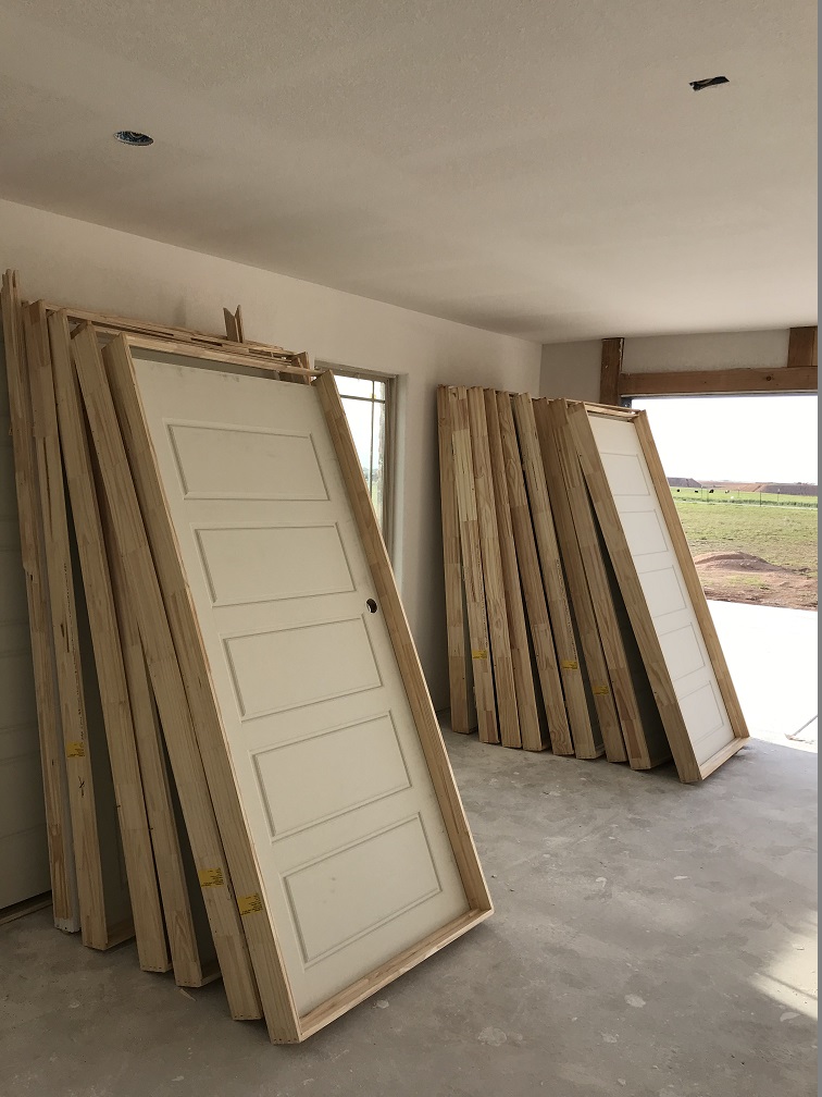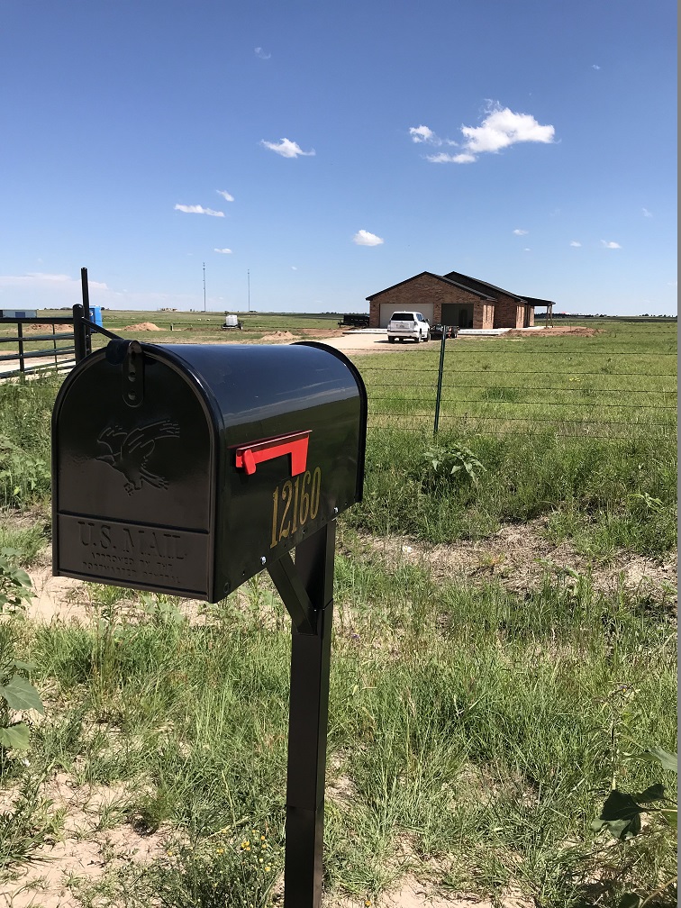 JUNE brought more installations that made the house feel more like a home: hardware, interior doors, a garage door ( the single door was the wrong size and had to be re-ordered), more lighting including all recessed lights, exterior lights and pendant lights and more ceiling fans were installed by the owner ;-), the cedar porch posts and A/C was installed, and the LVP flooring arrived and the exterior doors were painted. We’ve had a terrible fly problem and we think it comes from the neighboring sheep herd, but once the A/C was installed we were able to close up the house and that helped a lot. Randy registered us at the post office and put up the mailbox so we’re making the new address official: 12160 CR D, Pampa, TX 79065.