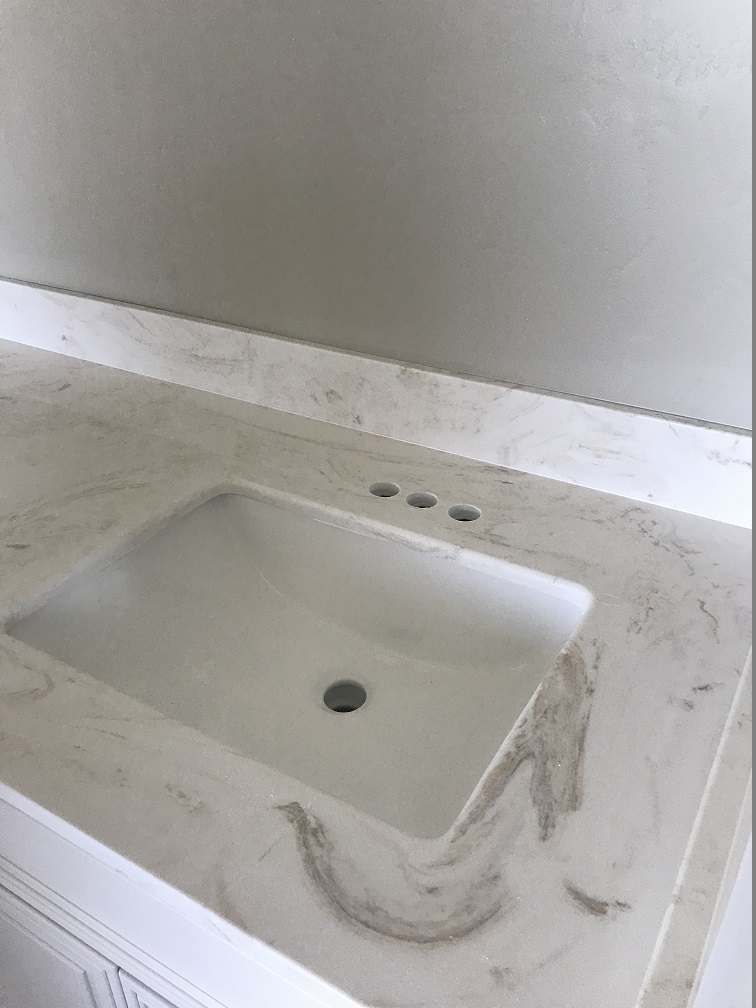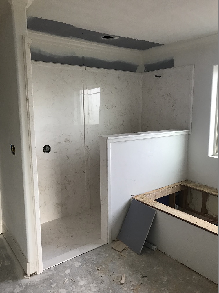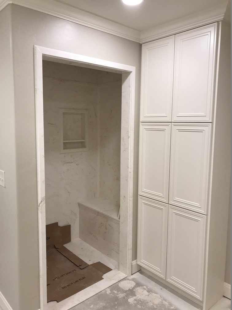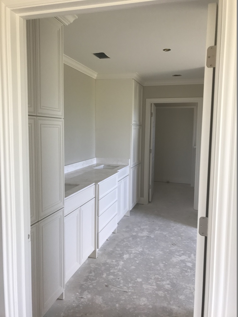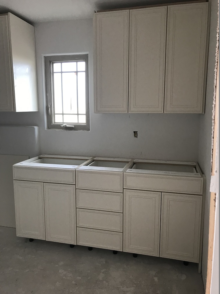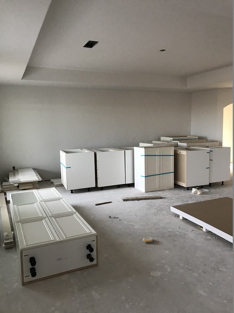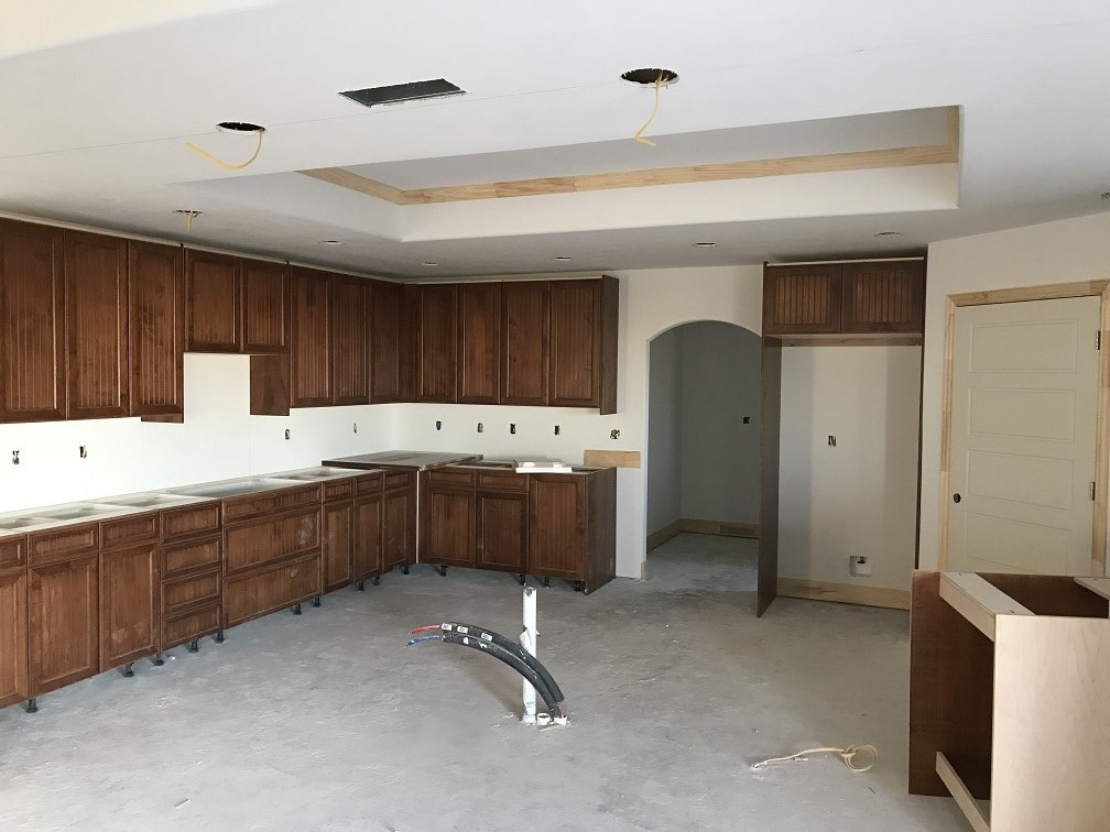 Randy installed lighting fixtures and the bathroom and utility room cabinets were installed. The kitchen cabinets also arrived and were ready to be installed, but they were the wrong stain color and we would have to wait another month to get the right cabinets installed in the kitchen. The cultured marble countertops in the bathrooms, the showers and tub enclosure were also completed. The interior doors were delivered, ready for the painters.