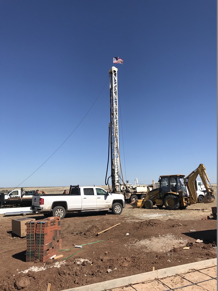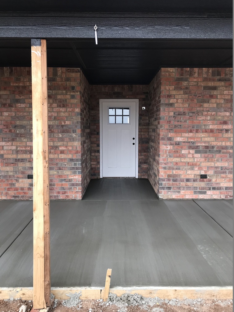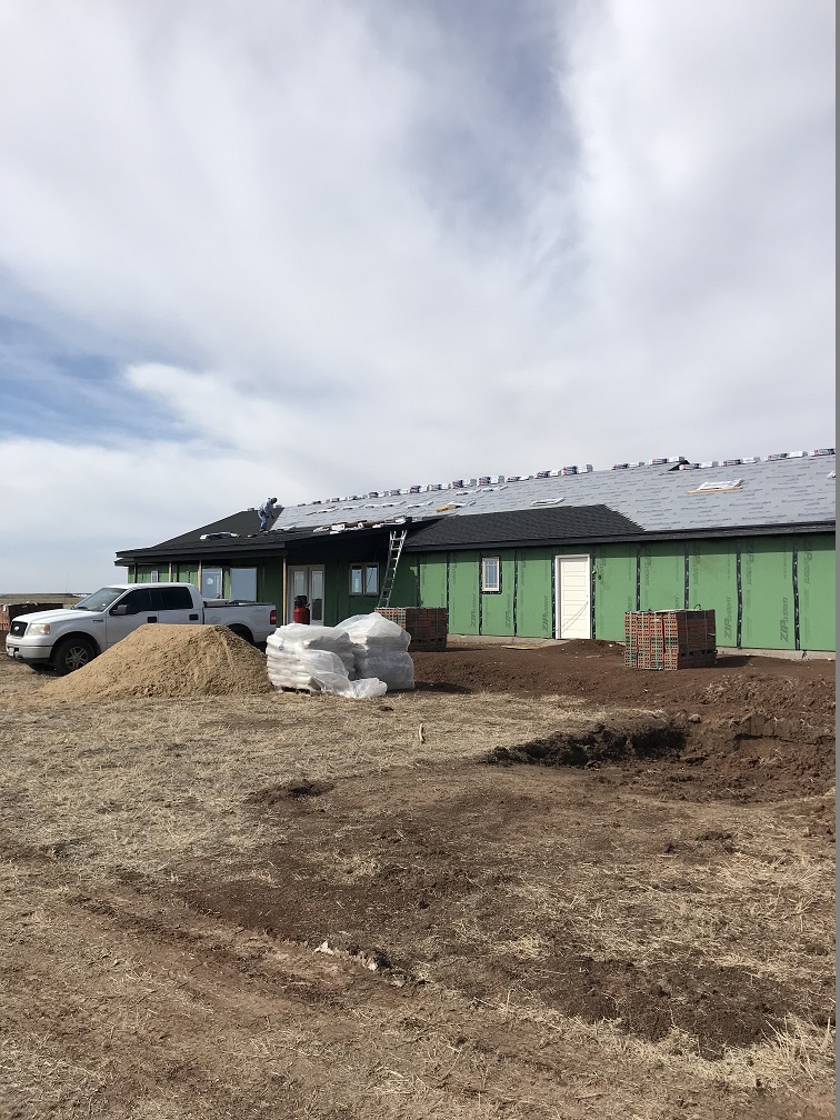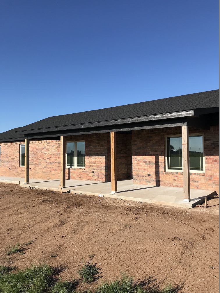 April was a productive month: the framers finished, the exterior doors and windows were installed and the soffit was put on and painted black to match the black composition roof. Randy wired the porches for lighting and fans, the roof, insulation, sheet rock and brick was installed, and concrete for the porches and sidewalks was poured. The water well service drilled, hit water at less than 600 feet in the Ogallala Aquifer and installed the pump.